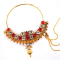 Created and crafted by skilled craftsmen, this stunning Kundan Nath is pleasing and graceful. The product comprises 18 Carat Gold Plated materials for exceptional longevity and durability using utmost expertise. Elaborate Kundan Work adds to the aesthetics of the piece. The brown-colored stones make it suitable for any attire. Its flexible size is appropriate for wearing on any occasion. The brides can look forward to styling this stunning piece of jewelry on their special day.