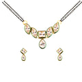Get this designer Kundan mangal sutra with Kundan earrings for women. A necklace adorned with floral designs that are of heirloom quality. Flawless gold-plated exquisite fine jewellery is fashionable yet ethnically divine. Glam yourself up with fashion and class to dazzle everyone around you. A forever mangal sutra suspended on classic gold and black beads depicting your infinite love, companionship, and charm. Mangalsutra set made of splendid American diamond earrings for glamorous you. A wedding Necklace set of sacred thread binding you and your love forever. Perfect for you!