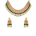 This gold plated Rani Har design necklace and earrings set comes in droplet shape with white and green Kundan stones embedded as well as pearls attached with the lowest layer. It makes the whole neck look loaded with stones delicately and ears look charming as well. It is a party wear set.