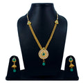 This stunning gold plated Rani Har design necklace and Jhumka earrings set is everybody's favourite. The necklace comes with a pearl chain with green Kundan stones and white stones attached with a green pearl drop at the bottom. The earrings come in a Jhumka design with a green pearl drop attached. The set is party wear.