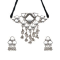 Upgrade your jewelry box with this modern and stylish choker set. The intricately crafted choker will add a glamorized touch to your look. Beautiful mirror embellishments adorn the oxidized silver set. Charismatic tassels and elaborate charms grace this ornament. This minimalist collar piece can add a contemporary touch to your apparel. Add a little drama to your bespoke outfits with the adorable set of jewelry. Rock your fashion-forward choice with this superior quality accessory.