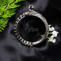 Fall in love with this epitome of tradition and modernity going hand-in-hand. The lines supporting the peacock on the front with a clean jaal pattern is a must have in the accessory collection. The handcuff has a unique peacock design on one side and tiny beads in a row that makes it stand out from the rest. The oxidized silver polish brings a glossy look. In addition to its durability, the product is easy to carry.