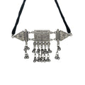 Adorn yourself with a beautiful and classy Banjara silver oxidized choker. It is made in Indian classic design where the main feature of the choker is a light-weight and silver oxidized Boho design along with small ghungroos. The design is done on a rectangular body with two tringle elements with a unique design, holding from the side. It is further attached with black thread to wear around your neck. pick this up for your Casual and traditional wear or any contemporary wear.